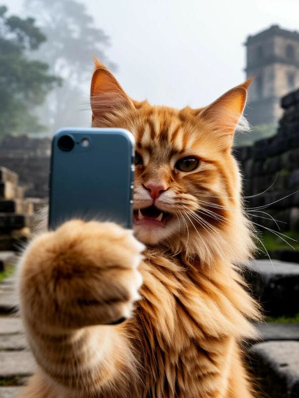 Пушистый рыжий кот делает селфи на Великой Китайской стене зажав смартфон в лапке, на фоне древние каменные плиты и сторожевая башня, окутанные утренним туманом, кот широко ухмыляется в камеру, а его шерсть буквально светится в лучах тёплого солнца, сверхчёткая проработка текстур малая глубина резкости
