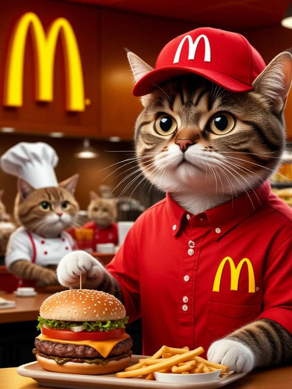 Уютный зал McDonald's где у стойки вас встречает усатый котик в аккуратной фирменной кепке и алой рубашке, он с гордым видом передает вам поджаристый чизбургер, от которого исходит аппетитный аромат, на заднем плане другой пушистый повар ловко собирает заказы, создавая атмосферу милого и радушного сервиса.