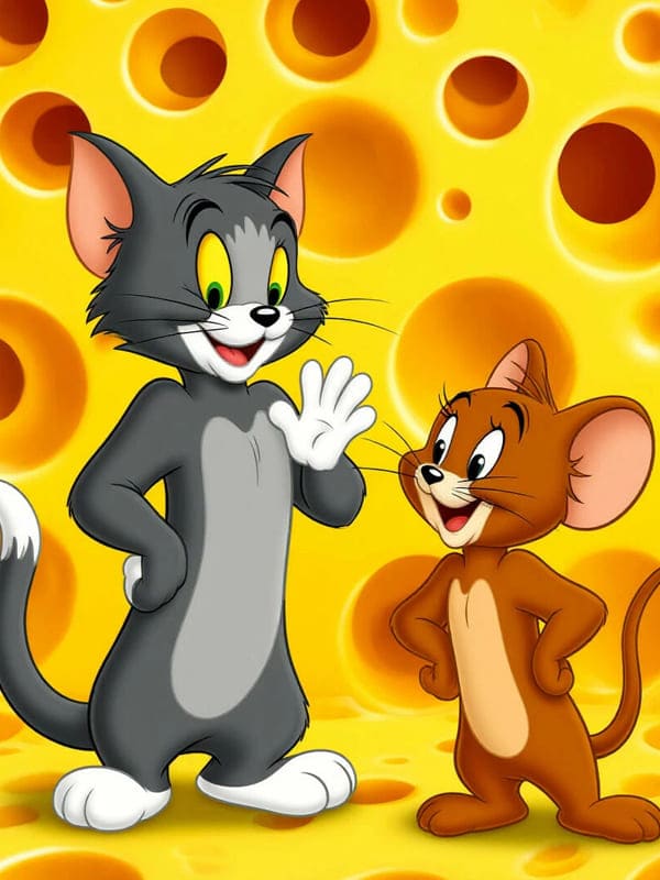 Два анимационных персонажа кот и мышь из мультфильма Том и Джери, кот серый с белыми лапами и ушами, а мышь коричневая, они стоят на фоне сыра который выглядит как швейцарский с характерными дырками, кот и мышь улыбаются и смотрят друг на друга