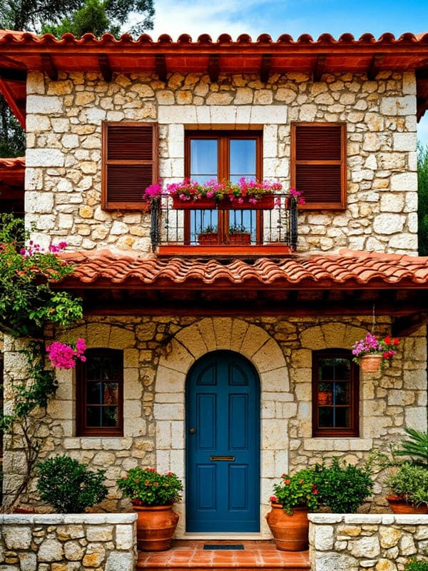На картинке изображен уютный дом в средиземноморском стиле, он имеет каменные стены, красную черепичную крышу и большие окна с деревянными ставнями, на балконе и у входа растут цветы в горшках, входная дверь синего цвета с арочным верхом, вокруг дома видны камни и растения, создающие атмосферу уюта и гармонии с природой