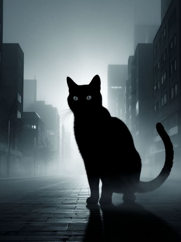 В густом тумане ночи абстрактный силуэт гигантского кота движется сквозь минималистичный городской пейзаж