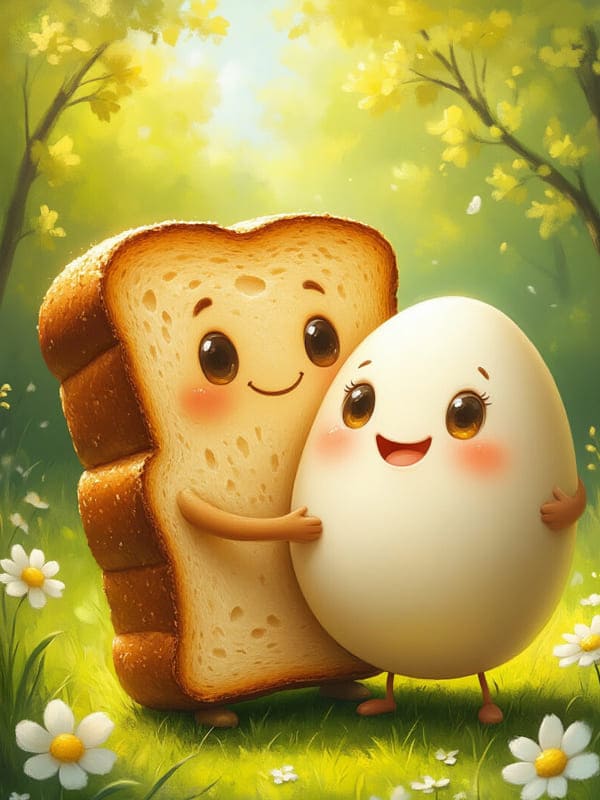 Иллюстрация на которой изображены два персонажа, один в виде куска хлеба, а другой в виде яйца, они оба имеют милые, антропоморфные черты, такие как глаза и рот, хлеб обнимает яйцо создавая ощущение тепла и уюта, фон изображения выполнен в мягких зеленых и желтых тонах.