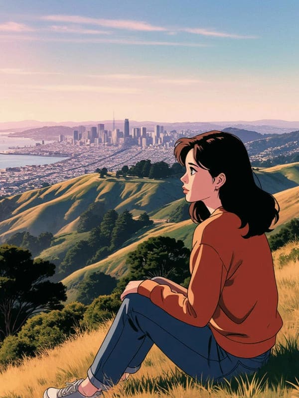 Винтажный кадр в стиле аниме 90-х, девушка сидит на холмах в Сан-Франциско задумчиво глядя вдаль, всё пронизано лёгкой ностальгической дымкой и характерной для той эпохи зернистостью плёнки