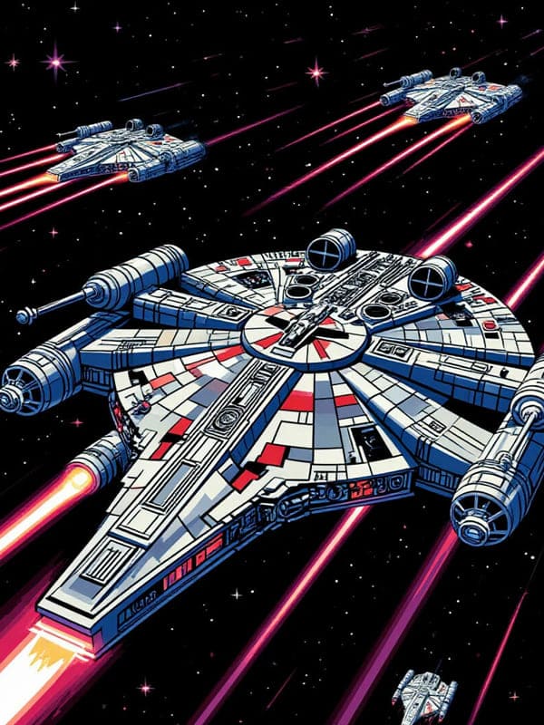 Пиксельный аркадный ретро стиль космический корабль стремительно уходит от погони истребителей в глубинах космоса, искры лазерных залпов, CRT свечение и зернистость старого экрана создают эффект игры 80-х, корабли мерцают 8-битными спрайтами, а звёзды на чёрном фоне растягиваются в световые полосы на гиперскорости