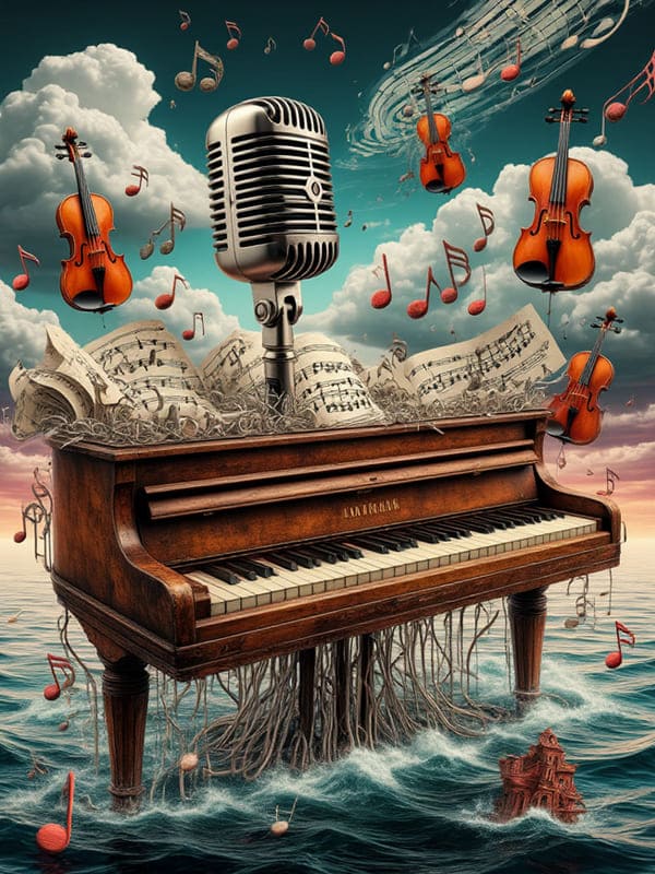 Старинный микрофон, вплетённый в парящее пианино, окружённое электрическими облаками, высокая детализация 8K, реалистичность, скрипки, сделанные из парящих музыкальных нот, проработаны до мельчайших деталей, яркие кислотные цвета, всё это на фоне интригующего антиутопического пейзажа из линованной бумаги, посреди воды.