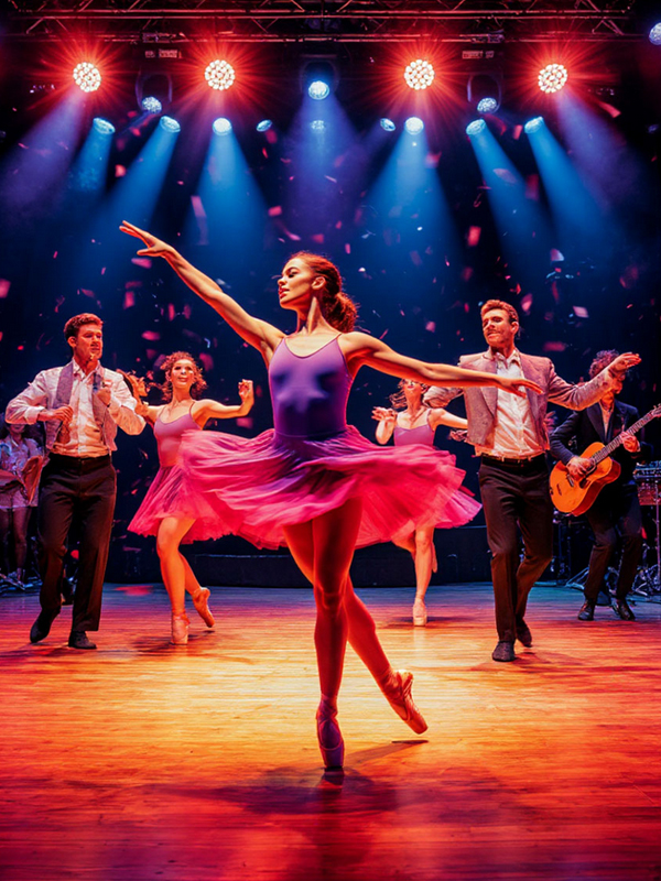Яркий постер, запечатлевший момент живого выступления, динамичные танцоры в движении и музыканты на сцене, полностью поглощённые исполнением, никакого текста, только чистая визуальная энергия шоу