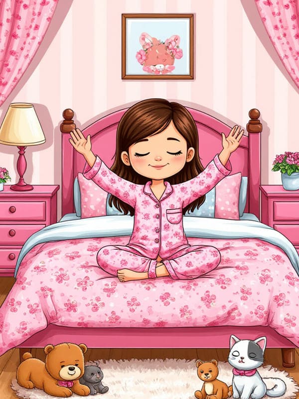 Комната выполненная в стиле мультфильма в центре внимания находится девочка, которая сидит на кровати с закрытыми глазами и поднятыми вверх руками, как будто наслаждается моментом раннего утра, она одета в розовую пижаму с цветочным узором, кровать украшена розовым покрывалом с цветочным узором и подушками, рядом с кроватью стоит розовый комод с лампой и горшком с цветами, а на полу лежит пушистый коврик, на котором сидят плюшевые игрушки.