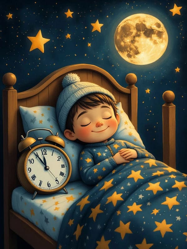 Уютный рисунок на котором изображен спящий ребенок лежит в кровати, укрытый одеялом с рисунком в виде звезд, на голове у него шапка с помпоном, а на лице улыбка, рядом с кроватью стоит будильник показывающий время, а на заднем плане изображены звезды и луна