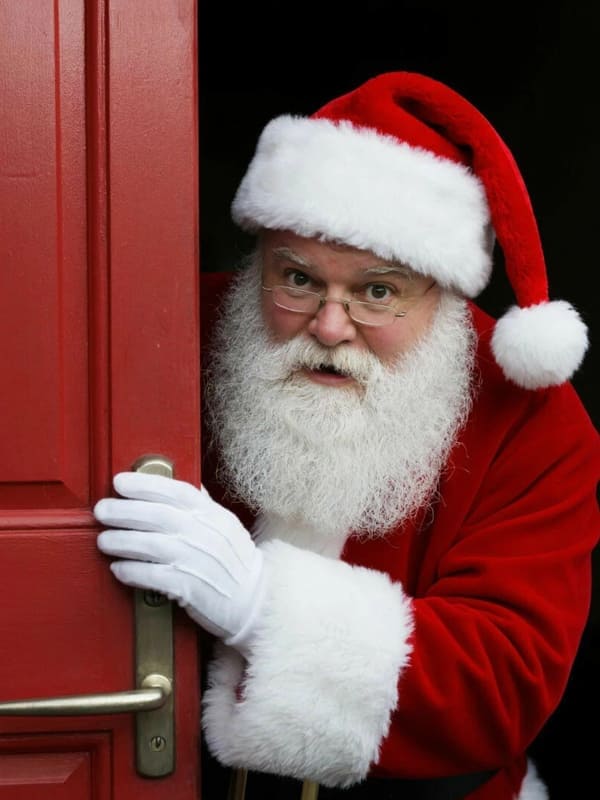 Персонаж Санта-Клауса выглядывает из-за красной двери держась за ручку, у него белая борода и усы, а также красный колпак с белым помпоном и белые перчатки, его лицо выражает удивление или любопытство.