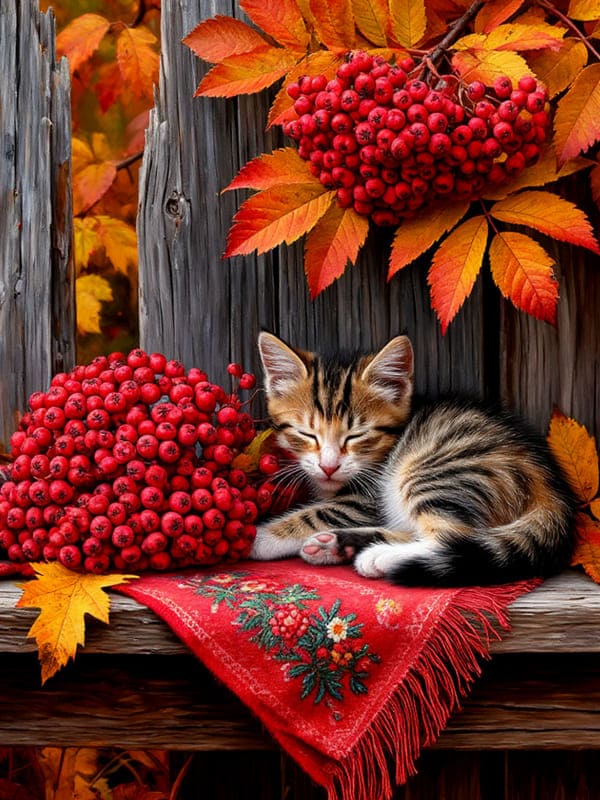 Крупным планом написана гроздь рубиновой рябины сверкающая на фоне старого забора, на деревянной лавке укрытый вышитым платком дремлет трехцветный котенок, мягкий осенний свет ласкает его шерстку и играет на золотых листьях